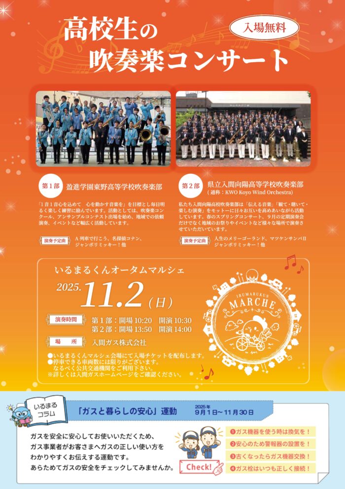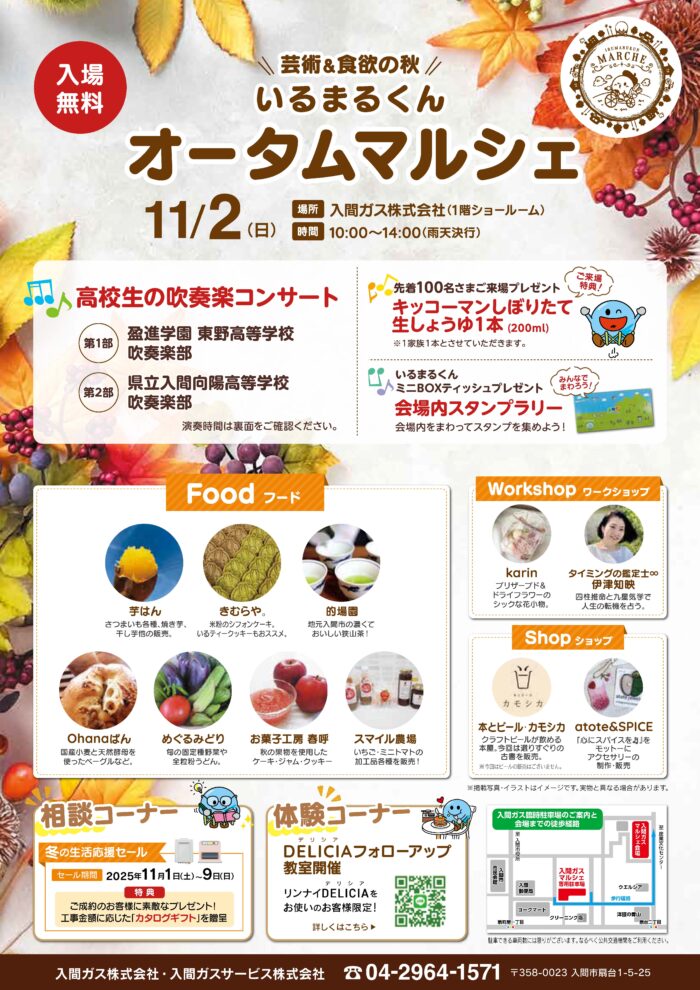 「いるまるくんオータムマルシェ」開催のお知らせ 2025年10月6日 平素より入間ガスをご愛顧いただき、誠にありがとうございます。「いるまるくんオータムマルシェ」を開催いたします。社員一同、みなさまのご来場心よりお待ちしております。